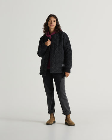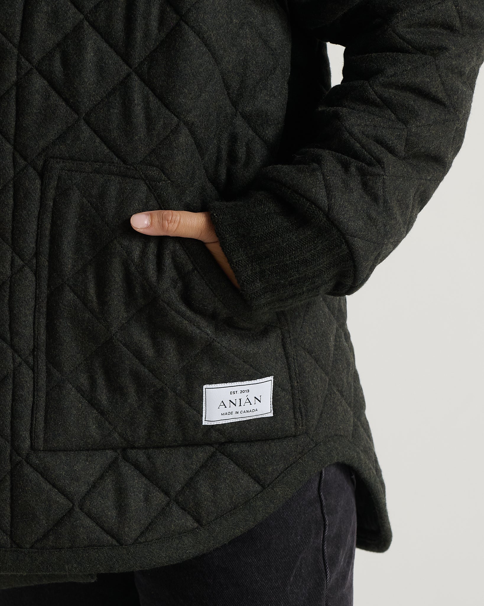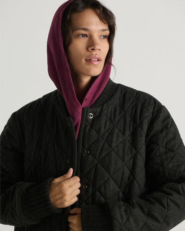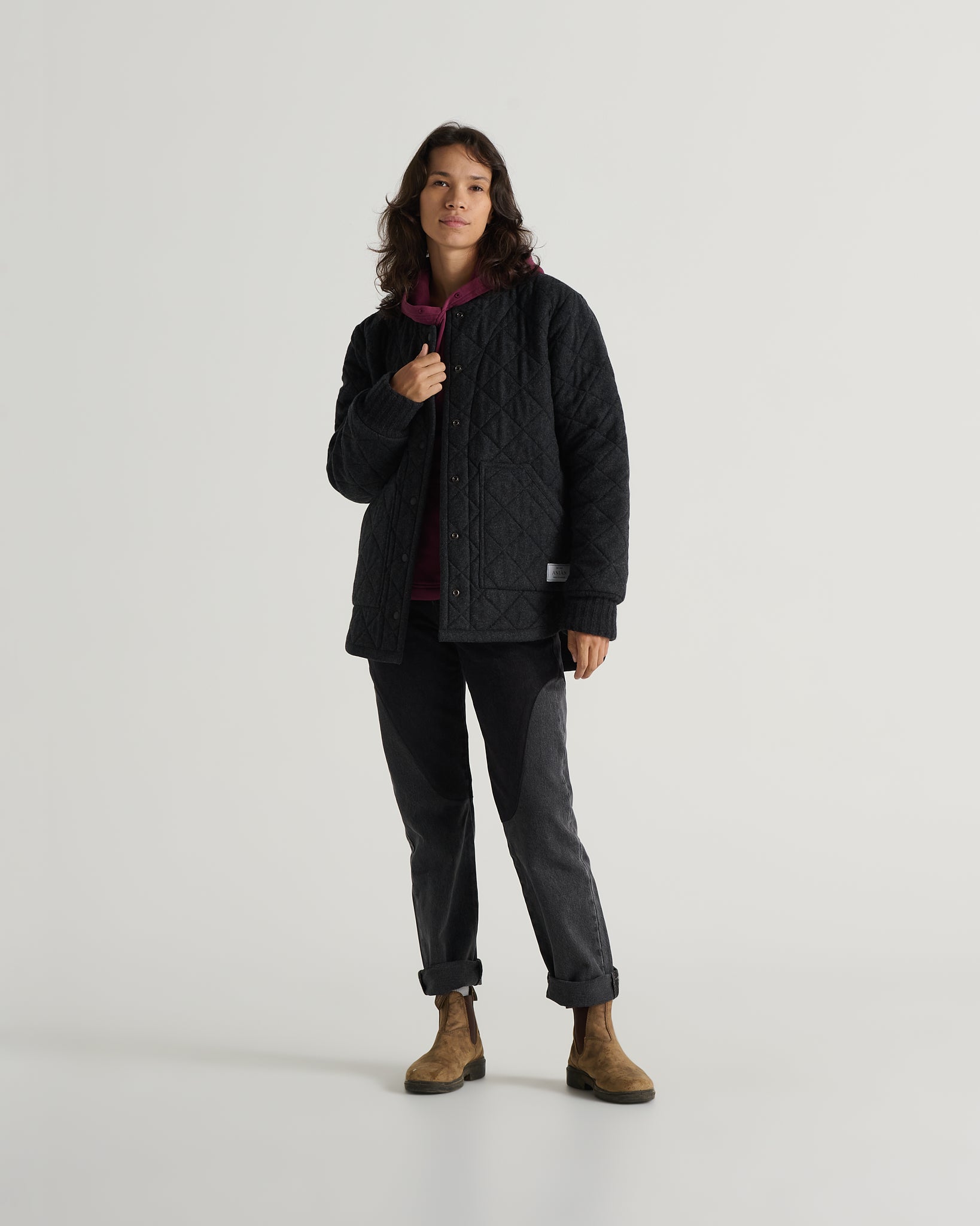 Breath turns frosted, rivers rise, and each winter storm brings a fresh canvas, reminding us of nature’s ability to rejuvenate and inspire with every season. In the spirit of renewal, we introduce the Quilted Wool Jacket—the warmest layer in our women’s collection. Offering natural insulation and weather resistance without added bulk, this jacket is thoughtfully crafted with a densely woven, post-consumer recycled Melton wool outer and a low-loft wool batting sourced from leftover fibers in the salvaging process. Made with no added dyes, the design features a soft post-consumer recycled cotton lining, a snap-button front, and quilted patch pockets that provide welcome space for essentials; the ribbed collar and cuffs are knit from a warm recycled merino and cashmere blend. Generous room through the chest and arms makes layering a breeze, while the scalloped hem lends an elegant silhouette that easily moves from outdoors to in. Combining enduring warmth with comfort in spades, the Quilted Wool Jacket is a trusted companion against the chill.