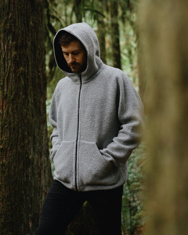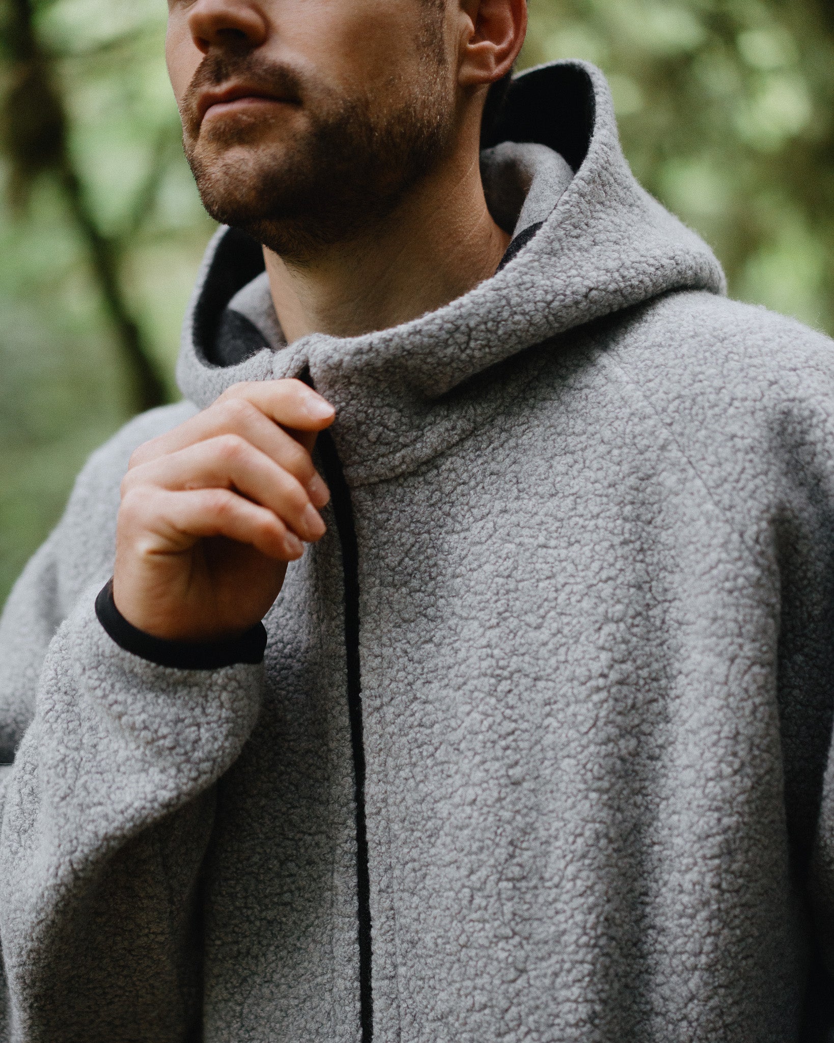 From tideline to alpine, almost all of our adventures lead us into cold, wet and stormy conditions—which are exactly where high-pile Sherpa wool excels. To make an all-weather insulating hoody for everyday or far away, we sourced a soft, warm and movement-friendly recycled wool blend. The breathability and temperature regulation of the thick-knit wool—which synthetic fleeces attempt to imitate—give it exceptional comfort and performance when worn on its own or as a midlayer under a shell, and the Melton-lined hood keeps the wind at bay. A fleece storm flap offers extra warmth, while our unique production process with no added dyes helps further reduce environmental impact.